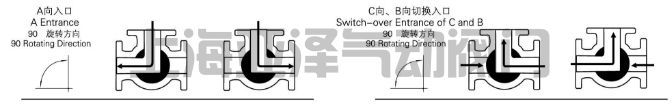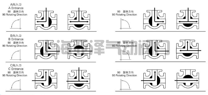 電動三通球閥分L型和T型,介質流通方向見下圖。L型電動三通球閥適用于介質流向的切換,能使相互垂直的兩個通道連通:T型電動三通球閥適用于介質的分流、合流或流向 切換,T型孔道可以使三個通道互相連通或使其中兩個通道連通,電動三通球閥一般采用三個閥座結構,亦可根據用戶要求采用四閥座結構。